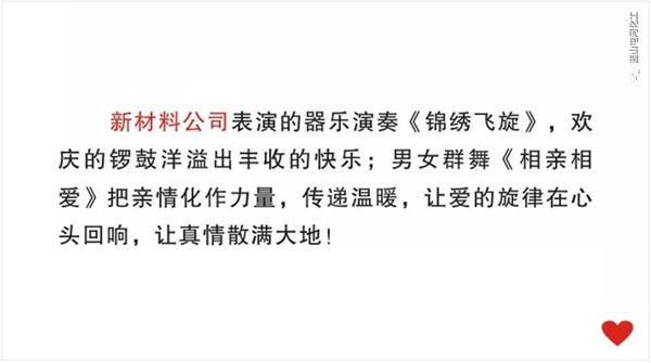 新材料公司表演的器乐演奏《锦绣飞旋》,欢庆的锣鼓洋溢出丰收的快乐;男女群舞《相亲相爱》把亲情化作力量,传递温暖,让爱的旋律在心头回响,让真情散满大地!